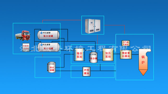 如此,即可確保氨水脫硝系統的安全性,才可使氨水最終順利進入噴射霧化模塊,由氨水脫硝噴槍噴出,對鍋爐煙氣進行脫硝處理。