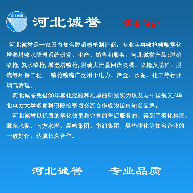 (2)增濕塔噴槍選用規范不銹鋼及耐磨合金,通過特殊加工工藝制成,具有耐酸、耐堿、耐高溫、耐磨損,使用壽命更長等特點。其霧化角度從30-110度,流量從110kg/h到1600kg/h,可滿足各種規劃生產線的需求。