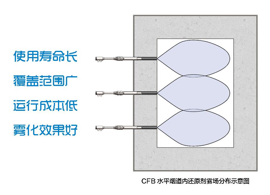 針對大爐膛的鍋爐,HBCY-FT高效節能鍋爐專用脫硝噴槍現已投入到眾多廠家使用,并解決了用戶在使用SCR脫硝時遇到的難題,得到用戶的普遍認可。使用這種長噴槍和短噴槍組合的方案,還原劑霧場覆蓋面積遠大于傳統普通噴槍,保證脫硝效率,降低用戶運行成本。